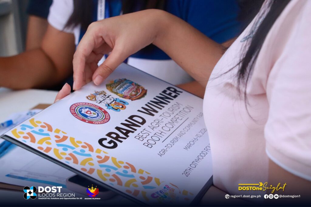 The Department of Science and Technology Ilocos Region (DOST Ilocos Region) was recognized as ๐†๐‘๐€๐๐ƒ ๐–๐ˆ๐๐๐„๐‘ โ€“ ๐๐ž๐ฌ๐ญ ๐€๐ ๐ซ๐ข-๐“๐จ๐ฎ๐ซ๐ข๐ฌ๐ฆ ๐๐จ๐จ๐ญ๐ก ๐‚๐จ๐ฆ๐ฉ๐ž๐ญ๐ข๐ญ๐ข๐จ๐ง during the Agri-Tourism and Community Fair held from March 6โ€“10, 2026, in celebration of the ๐Ÿ๐Ÿ–๐ญ๐ก ๐‚๐ข๐ญ๐ฒ๐ก๐จ๐จ๐ ๐…๐จ๐ฎ๐ง๐๐ข๐ง๐  ๐€๐ง๐ง๐ข๐ฏ๐ž๐ซ๐ฌ๐š๐ซ๐ฒ ๐จ๐Ÿ ๐ญ๐ก๐ž ๐‚๐ข๐ญ๐ฒ ๐จ๐Ÿ ๐’๐š๐ง ๐…๐ž๐ซ๐ง๐š๐ง๐๐จ, ๐‹๐š ๐”๐ง๐ข๐จ๐ง.